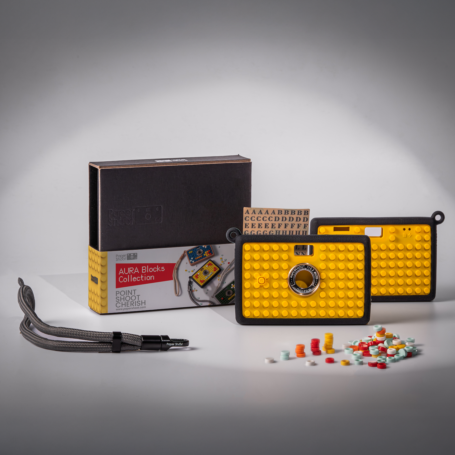 This case package includes: Aura Brick Panel, Silicone Bumper Frame, Tiny Brick Dots, Letter Stickers, Silk Cord Wrist Strap